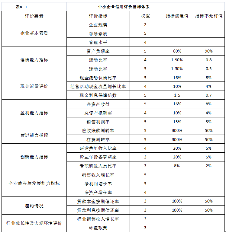 倉儲(chǔ)金融業(yè)務(wù)中,中小企業(yè)篩選的標(biāo)準(zhǔn)要根據(jù)國(guó)家對(duì)于中小型企業(yè)發(fā)展的指導(dǎo)思想,即“選擇重點(diǎn),規(guī)范操作,總結(jié)經(jīng)驗(yàn),翁不推進(jìn)”與“支持發(fā)展與防范風(fēng)險(xiǎn)相結(jié)合;政府扶持與市場(chǎng)操作相結(jié)合;開展擔(dān)保與提高信用相結(jié)合”的三個(gè)原則要求,結(jié)合企業(yè)的實(shí)際情況對(duì)中小型企業(yè)進(jìn)行篩選。倉儲(chǔ)金融業(yè)務(wù)是一項(xiàng)新業(yè)務(wù),為有效規(guī)避風(fēng)險(xiǎn),銀行對(duì)企業(yè)的審查相對(duì)嚴(yán)格,獲得批準(zhǔn)者一般都是各項(xiàng)業(yè)務(wù)素質(zhì)比較優(yōu)良的企業(yè)。比如廣東發(fā)展銀行在審貨時(shí),一般選取行業(yè)市場(chǎng)占有率位于前三位的企業(yè),而且產(chǎn)品暢銷、價(jià)格穩(wěn)定、流通性好,同時(shí)也考慮企業(yè)的財(cái)務(wù)狀況、實(shí)力、品牌知名度等,目的是控制好信貸風(fēng)險(xiǎn)。與傳統(tǒng)信貸業(yè)務(wù)的審查不同,倉儲(chǔ)金融業(yè)務(wù)對(duì)所服務(wù)的周末和小型企業(yè)的審核更強(qiáng)調(diào)企業(yè)的成長(zhǎng)性,這涉及該企業(yè)的還款來源。此外,經(jīng)營(yíng)管理團(tuán)隊(duì)、產(chǎn)品及其技術(shù)含量、市場(chǎng)等也是審查的重點(diǎn)。對(duì)中小型企業(yè)的信用評(píng)價(jià)指標(biāo)體系如表8-1所示,評(píng)價(jià)的要素包括企業(yè)基本要素、賠償能力指標(biāo)、現(xiàn)金流量評(píng)價(jià)、盈利能力指標(biāo)、營(yíng)運(yùn)能力指標(biāo)、創(chuàng)新能力指標(biāo)、企業(yè)成長(zhǎng)與發(fā)展能力指標(biāo)、履約情況、行業(yè)成長(zhǎng)性與宏觀環(huán)境評(píng)價(jià)。